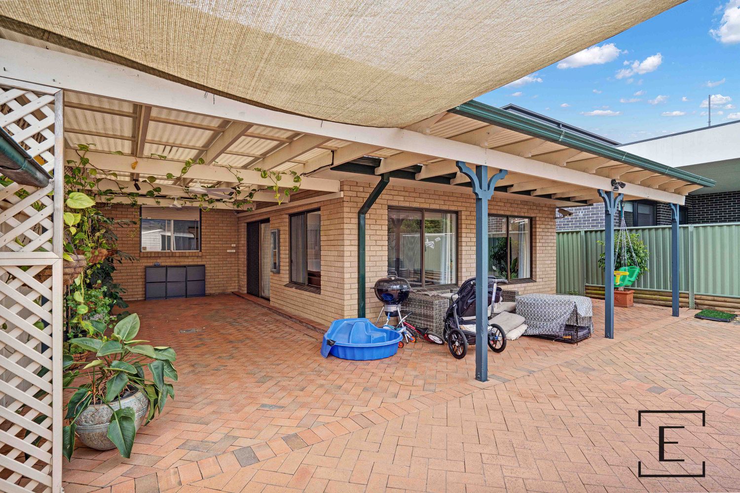 - A paved, family friendly backyard with an undercover outdoor dining area and a grassy space for casual entertainment.