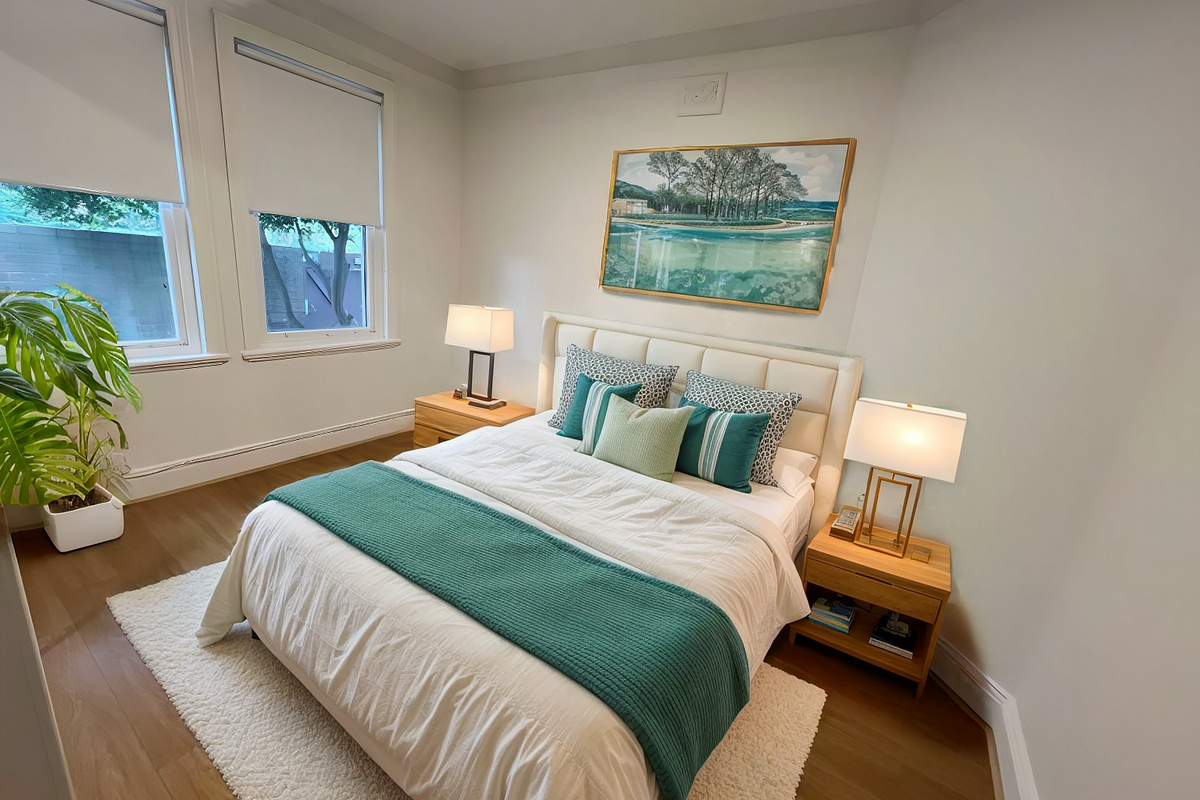 Sleek built-in wardrobes and fresh blinds