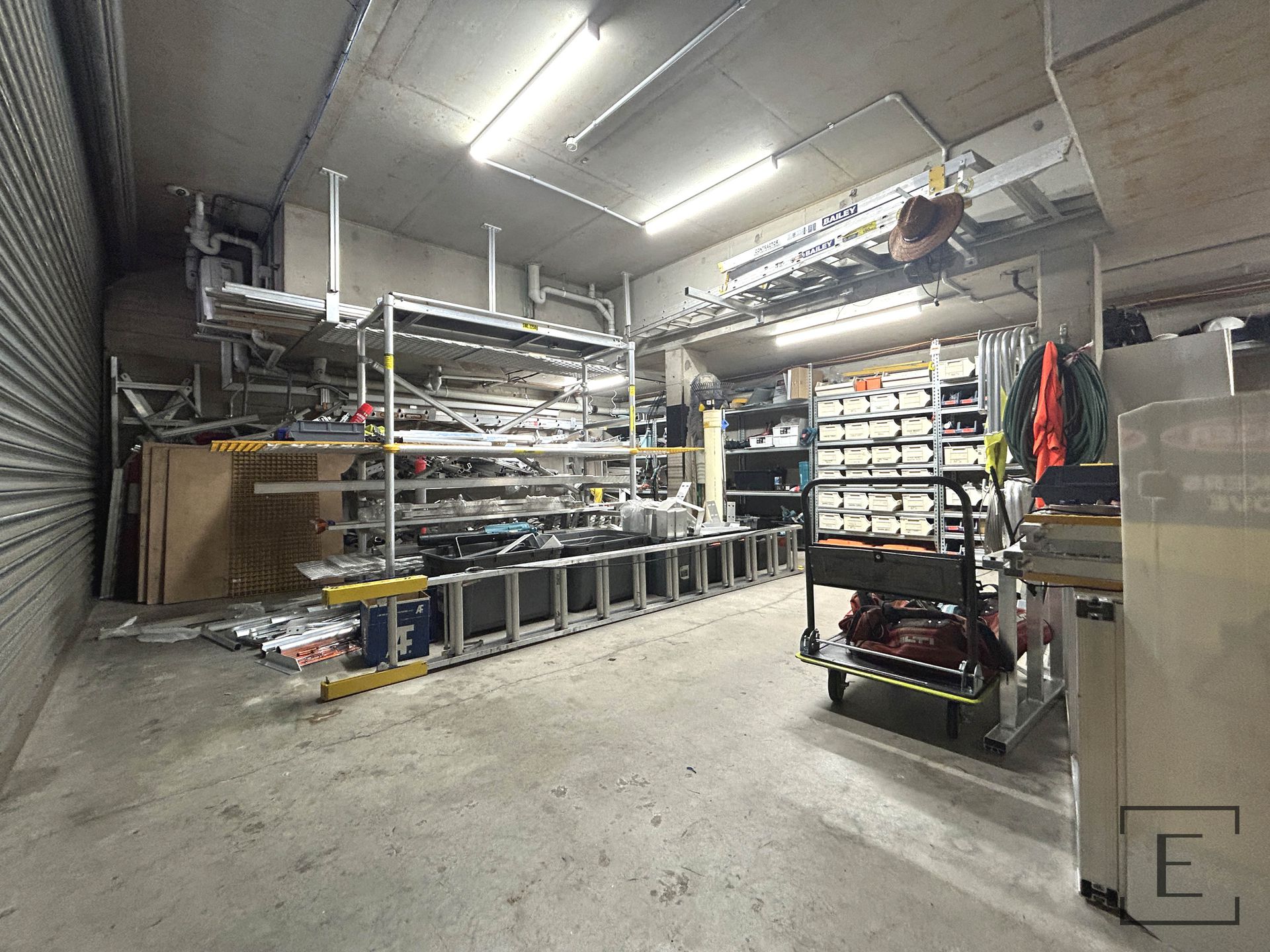 The property features a warehouse Storage / Garage space, an air-conditioned mezzanine office, and a stylish kitchen/breakout area also fully air-conditioned.