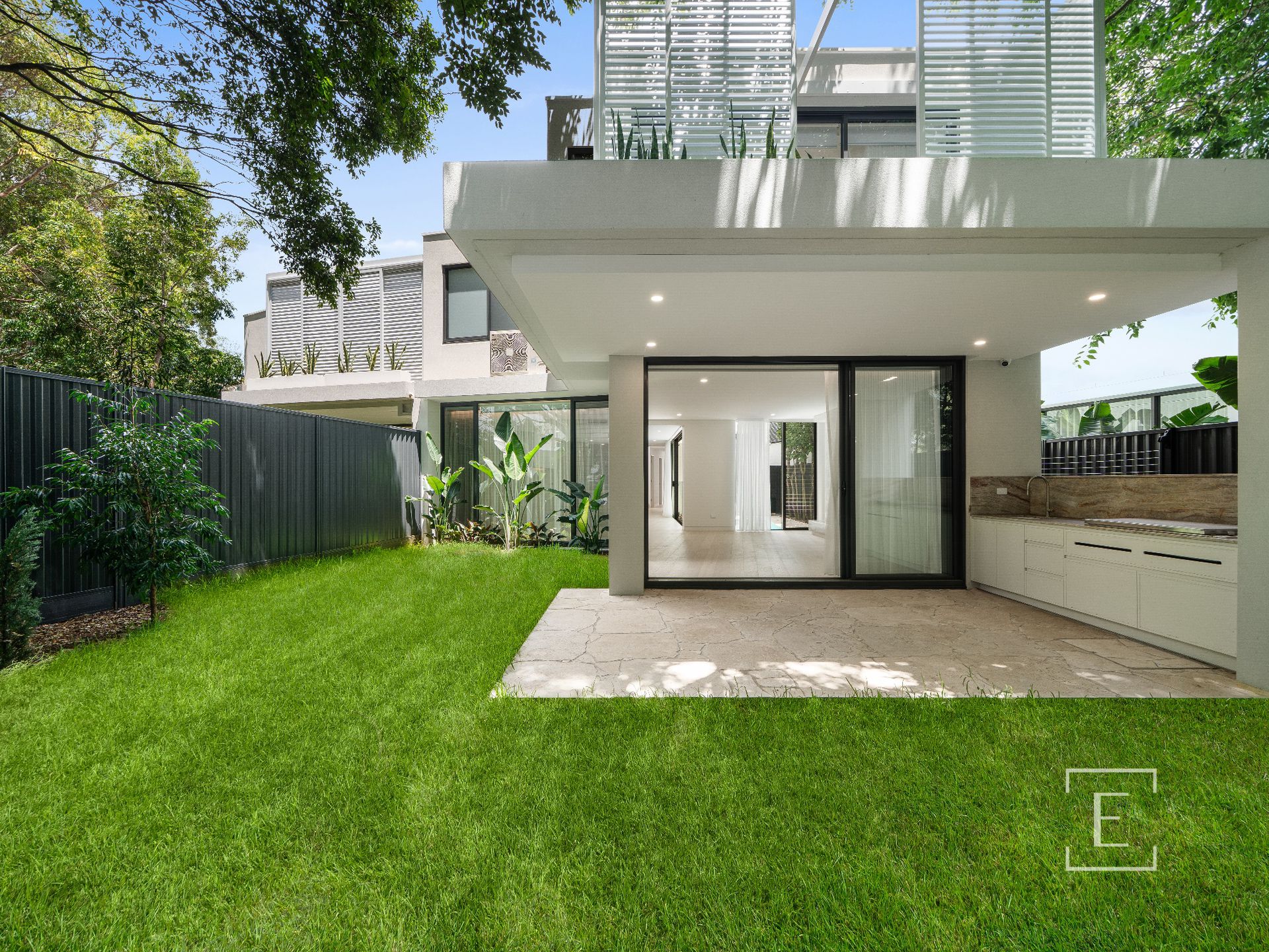 -North-facing garden framed by lush treescape
