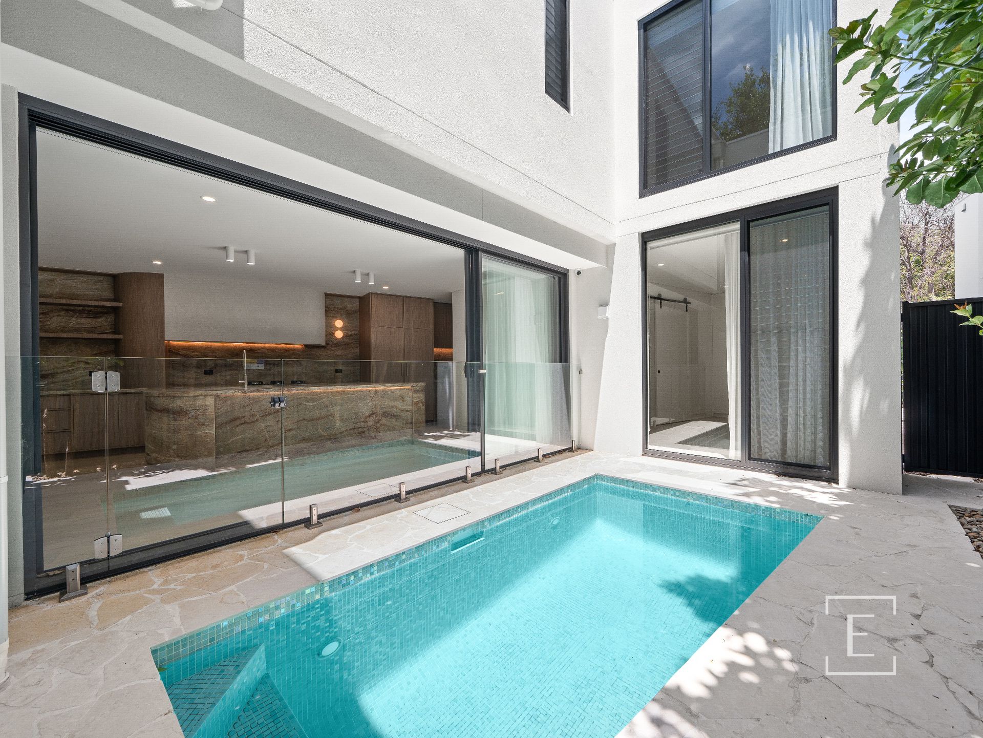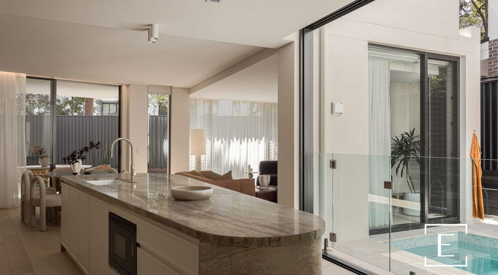 Nestled in a peaceful cul-de-sac opposite Minogue Crescent Reserve and playground, this two-storey home offers privacy and serenity. Conceived as an urban oasis, the pavilion-style layout is centred around a stunning Italian mosaic-tiled pool, flowing effortlessly to an entertainer’s terrace and a north-facing garden with direct access to The Crescent.