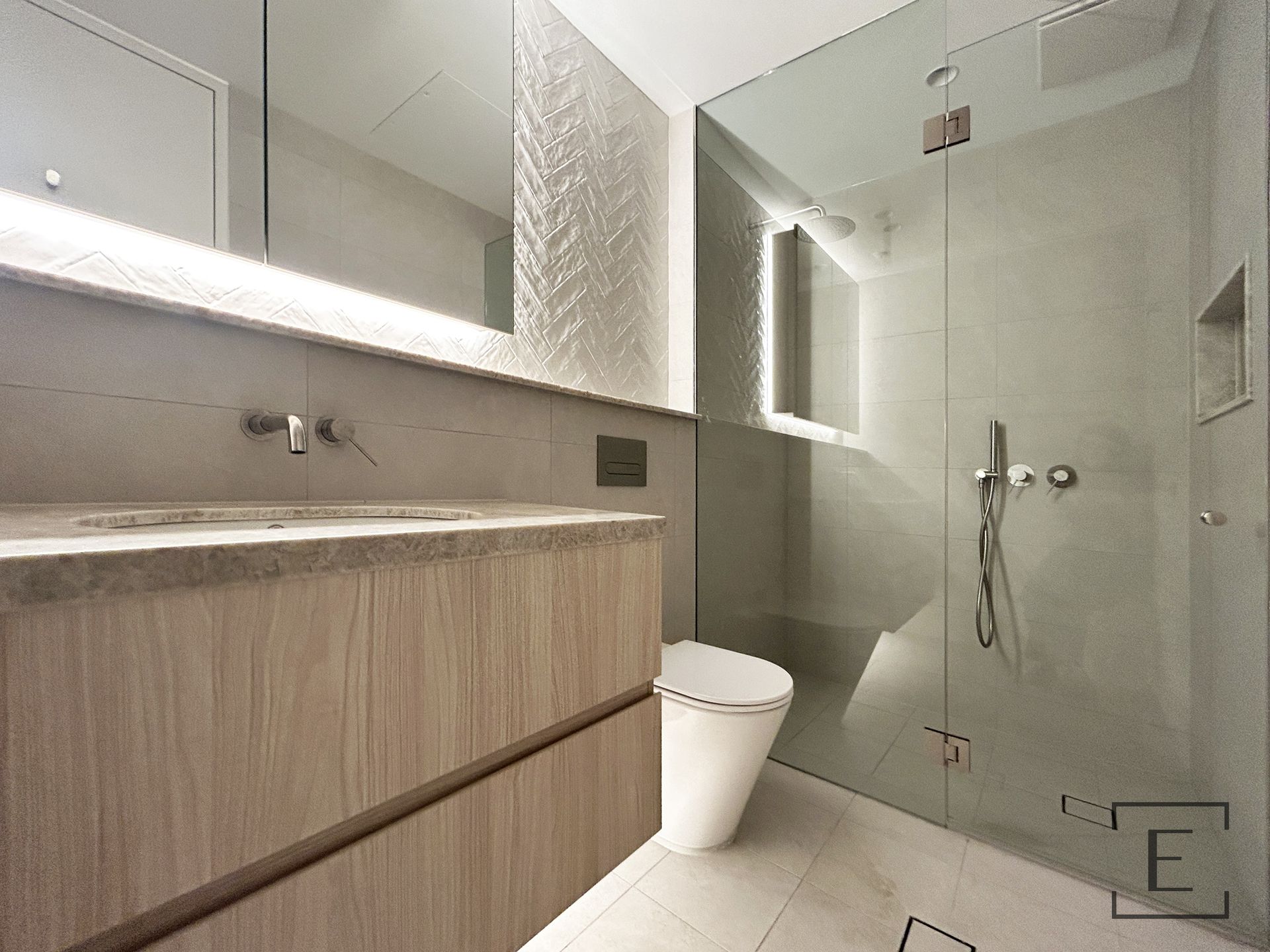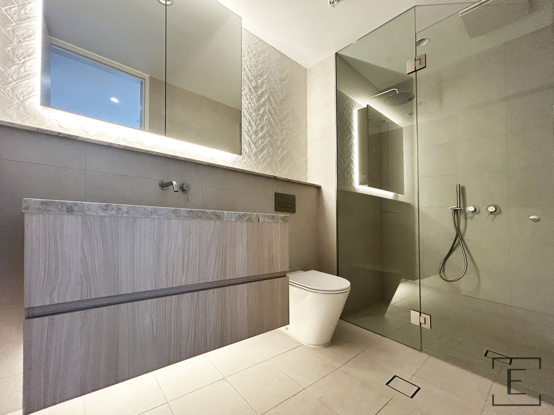 - Contemporary bathrooms with full-height tiling